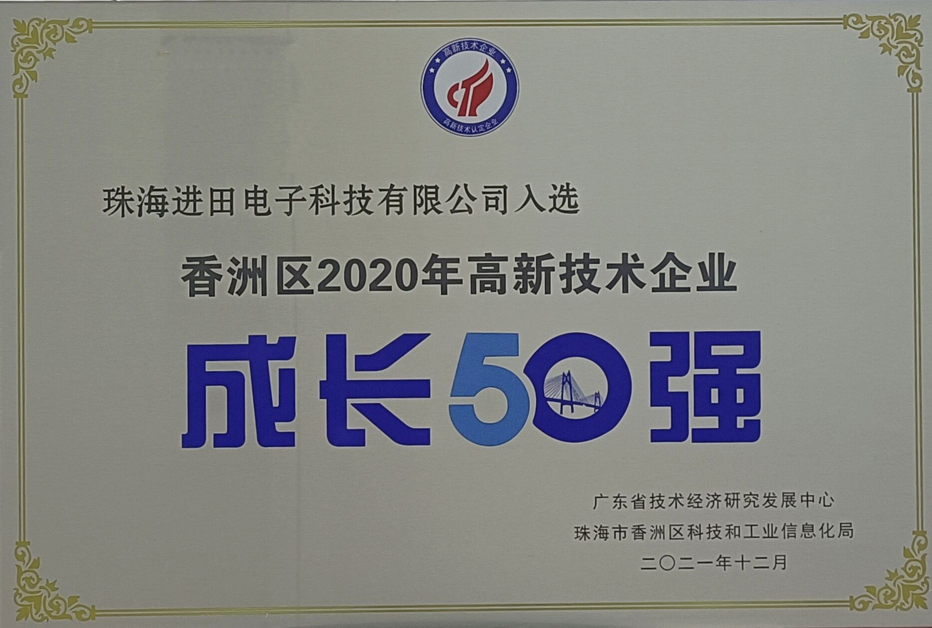 熱烈祝賀珠海進田電子科技有限公司榮獲珠海市香洲區(qū)2020年高新技術企業(yè)成長50強!